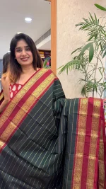 Elevate your ethnic wardrobe with this exquisite deep green silk saree, beautifully contrasted with a regal maroon pallu. The saree features fine gold zari stripes across the body, lending a sophisticated and timeless appeal. The richly woven gold zari border and pallu showcase intricate traditional motifs that enhance its luxurious character.